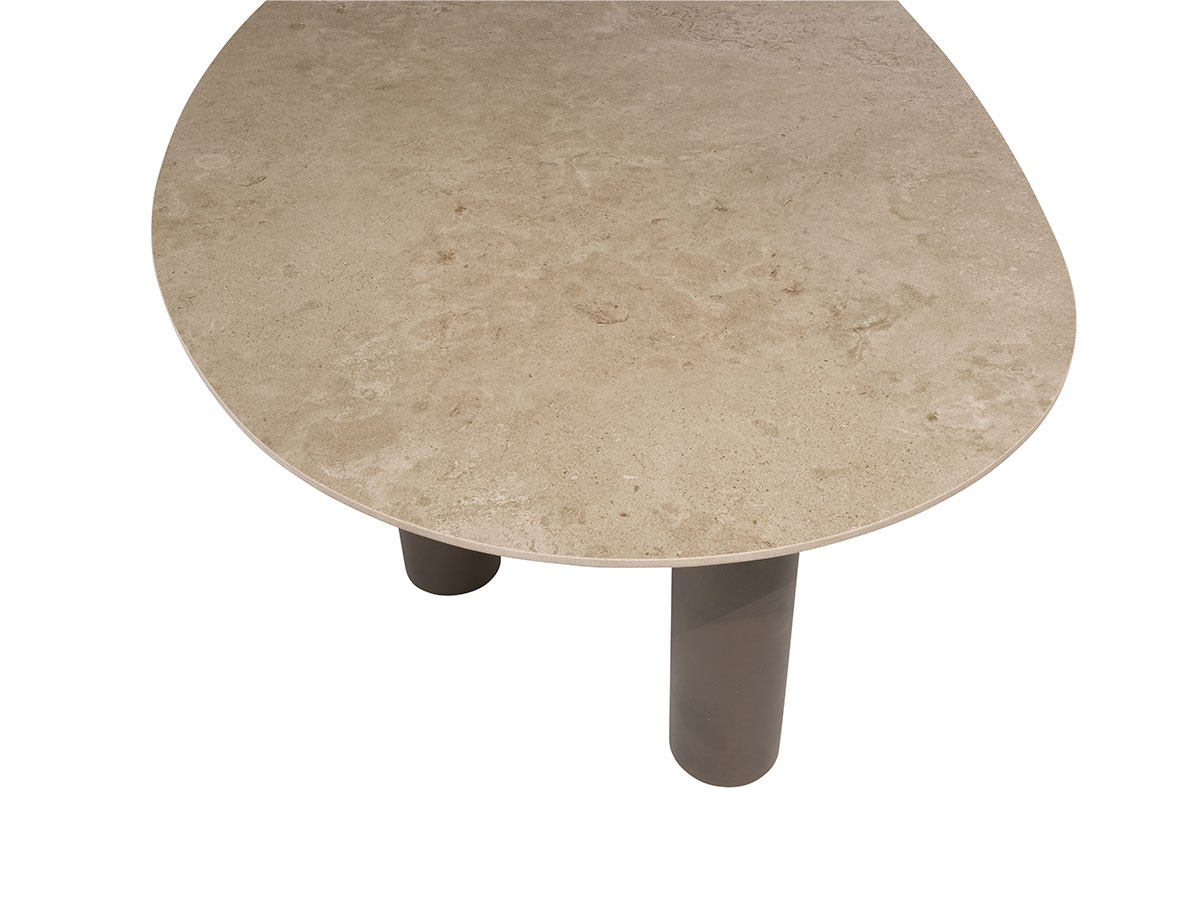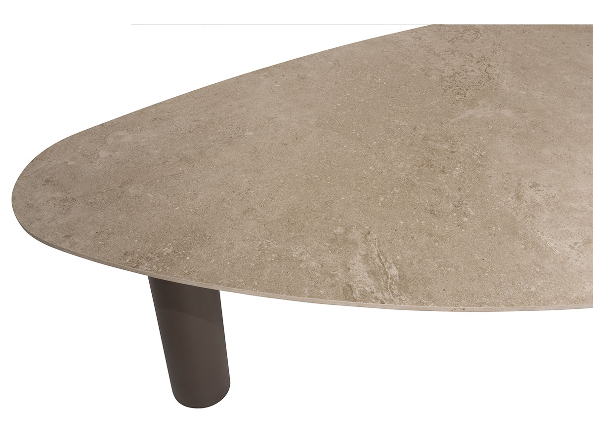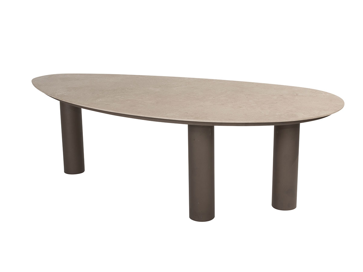 Getragen wird die schwere Keramikplatte vom Arizona 3-Bein-Set (Terre). Das markante Stativ-Design sorgt für eine moderne, luftige Optik und garantiert gleichzeitig maximale Standfestigkeit. Die Farbe „Terre“ – ein warmer, erdiger Braun-Anthrazit-Ton – bildet den perfekten Kontrast zur hellen Platte. Ein großer Vorteil der 3-Bein-Konstruktion: Niemand muss sich mehr mit störenden Tischbeinen an den Ecken herumschlagen, was die Beinfreiheit und die Flexibilität bei der Bestuhlung enorm erhöht.