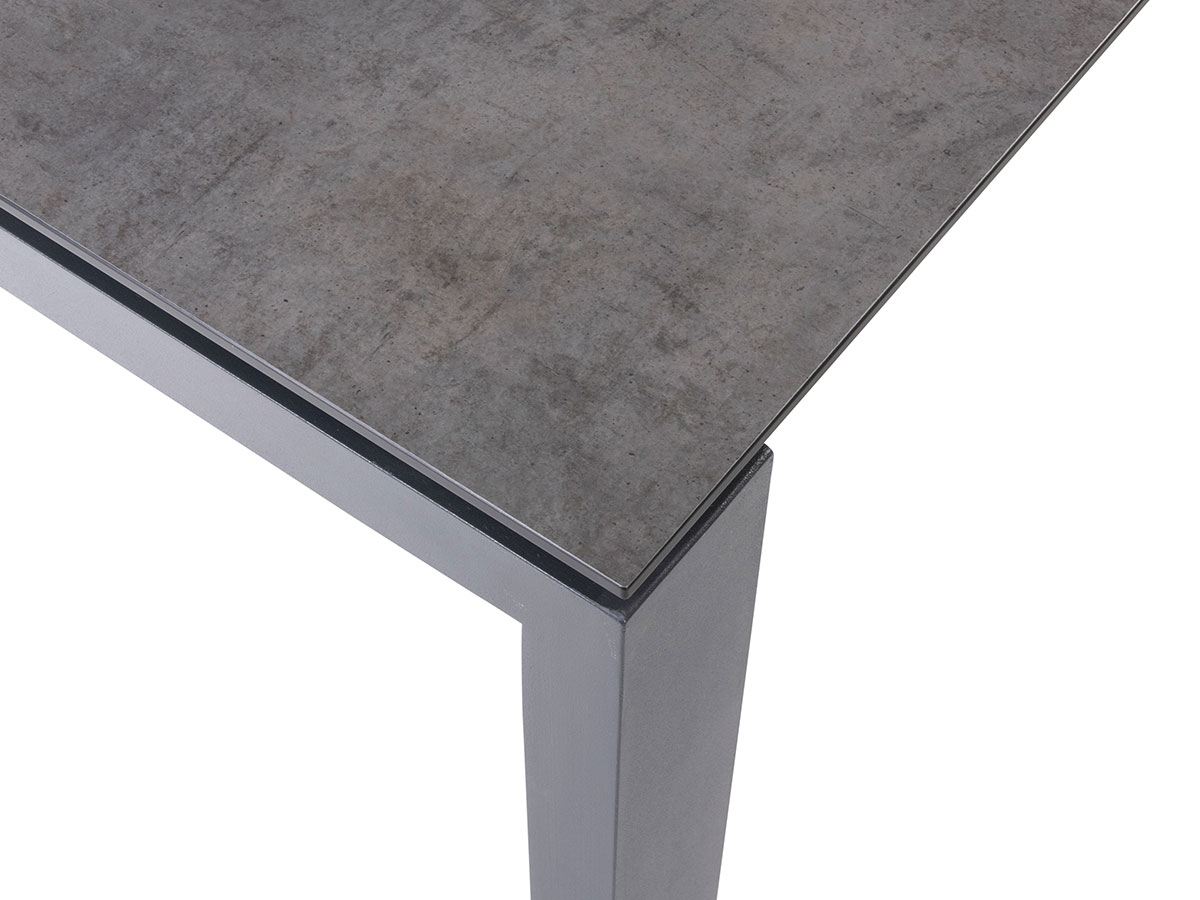 Das Herzstück dieses Tisches ist die Tischplatte aus High Pressure Laminate (HPL). In der Ausführung „Slate Anthracite“ imitiert sie täuschend echt die raue, edle Struktur von natürlichem Schiefer. Doch lassen Sie sich nicht täuschen: Im Gegensatz zu echtem Stein ist HPL extrem leicht, stoßfest und absolut unempfindlich gegenüber extremen Temperaturen. Ob klirrender Frost oder pralle Mittagssonne – diese Platte behält ihre Form und ihre tiefdunkle Farbe über Jahre hinweg.
