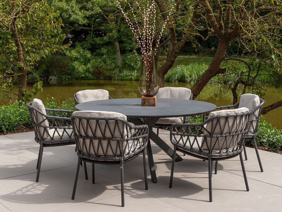 Machen Sie Ihre Terrasse zum Mittelpunkt für Familie und Freunde. Der Locarno Esstisch von 4 Seasons Outdoor ist in der großzügigen 160-cm-Variante ein echtes Statement-Piece. Das markante, kreisrunde Design bricht die oft starren Linien moderner Außenbereiche auf und schafft eine Atmosphäre, die zum Verweilen einlädt. Die Kombination aus einem robusten Edelstahlgestell in Anthrazit und der edlen HPL-Tischplatte in Schiefer-Optik verleiht Ihrem Garten ein modernes, luxuriöses Ambiente.
