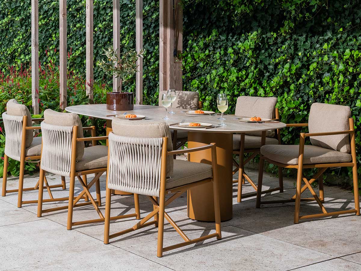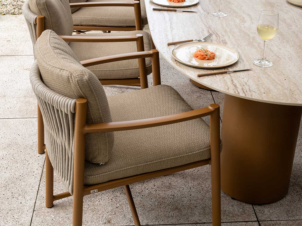 Mit einer Armlehnenhöhe von ca. 67 cm passt der Marina Dining Sessel unter die meisten gängigen Esstische. Wir empfehlen jedoch, die lichte Höhe Ihres Tisches vorab zu prüfen.