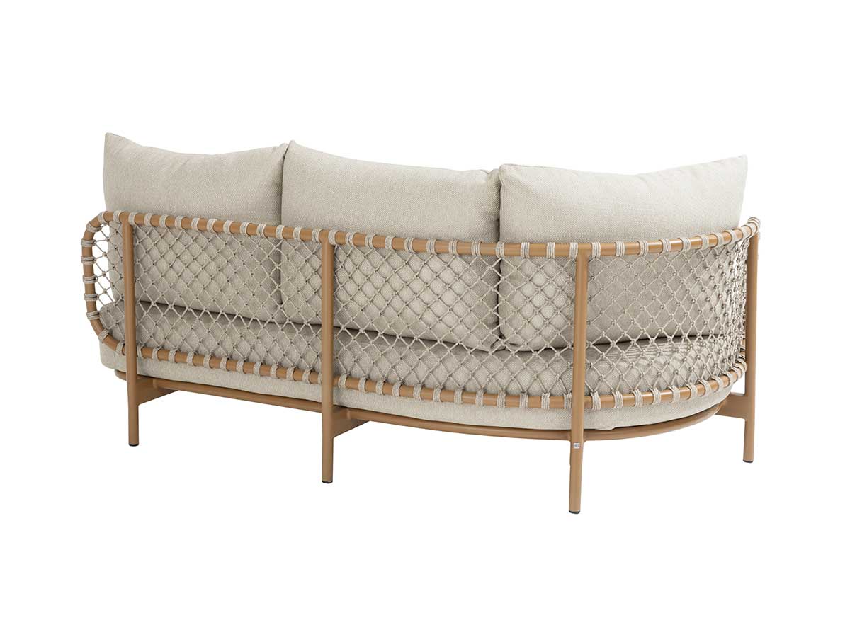 Das Herzstück dieses Sets ist das handgeflochtene Amber-Rope, das sich in sanften Schwüngen um die stabilen Aluminiumrahmen legt. Die transparente Struktur des Geflechts bewahrt trotz der großzügigen Maße eine optische Leichtigkeit. Die Kombination aus der klassischen 3-Sitzer Bank und der tiefen Cuddle-Bank schafft eine abwechslungsreiche Sitz- und Liegelandschaft, die durch die haptisch ansprechenden Volga-Amber Kissen in Bouclé-Optik perfekt abgerundet wird.