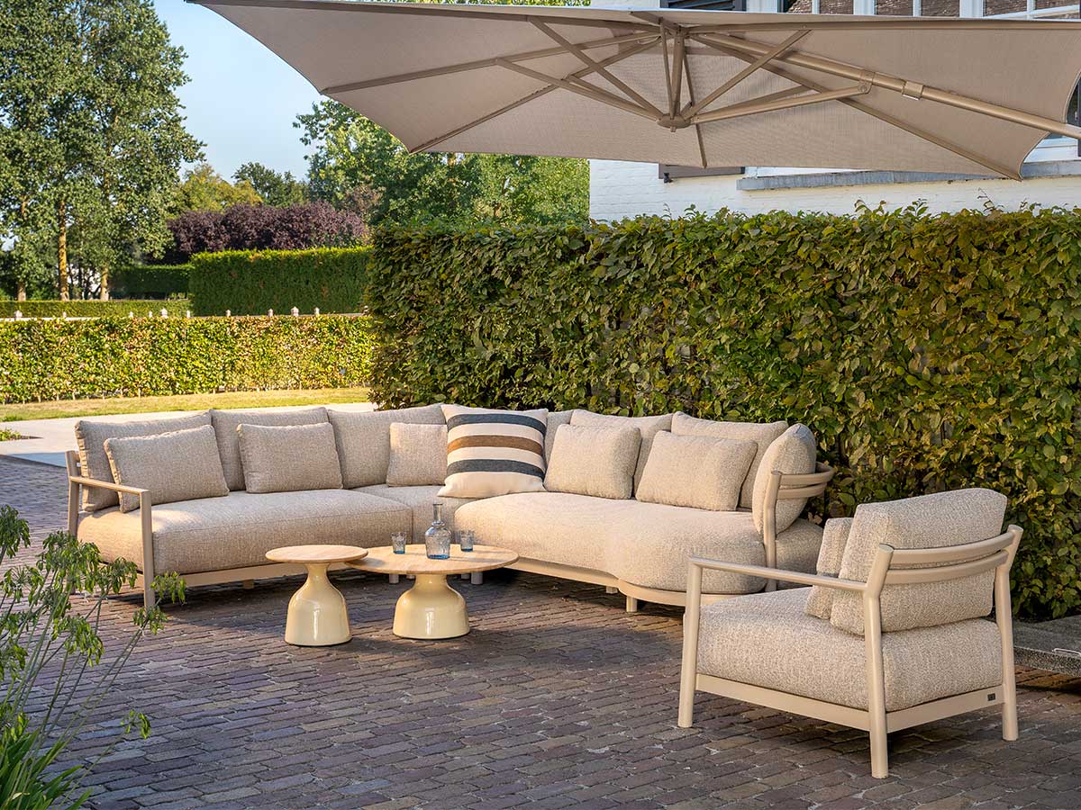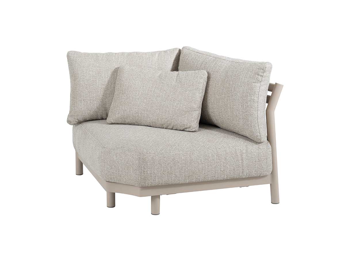 Das Mykonos XL Corner Modul (Art. 17211) bricht mit dem Klischee, dass der Platz in der Ecke einer Lounge zweitklassig ist. Dank der quadratischen Grundfläche und der tiefen Sitzfläche wird die Ecke zum begehrtesten Platz der Gruppe. Der pulverbeschichtete Aluminiumrahmen in Latte strahlt eine moderne Leichtigkeit aus, während die vier passgenauen Hikaron-Kissen für ein kuscheliges und dennoch stützendes Sitzerlebnis sorgen.