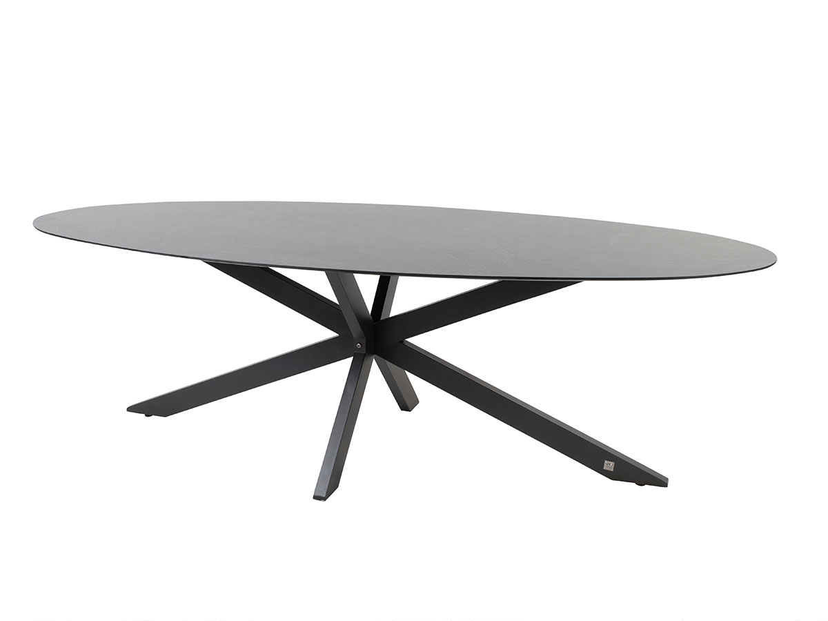 Setzen Sie neue Maßstäbe in Ihrem Außenbereich mit dem Privada Esstisch von 4 Seasons Outdoor. Diese exklusive Kombination aus dem skulpturalen Privada-Gestell in Anthrazit und der hochwertigen HPL-Tischplatte (High Pressure Laminate) in Schiefer-Optik vereint moderne Industriearchitektur mit extremen Outdoor-Eigenschaften. Die elliptische Form (240 x 113 cm) ist das ideale Mittelmaß zwischen einem rechteckigen und einem ovalen Tisch: Sie bietet die großzügige Fläche eines Rechtecks, fördert aber durch ihre sanften Rundungen die Kommunikation einer Tafelrunde.
