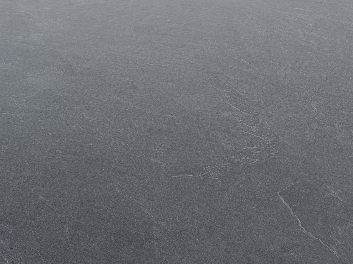 Die Tischplatte ist nicht nur optisch ein Genuss, sondern ein technologisches Meisterwerk. HPL besteht aus mehreren Schichten Papier und Harz, die unter extrem hohem Druck verpresst werden. Das Ergebnis ist eine Oberfläche, die so hart wie Stein ist, aber wesentlich pflegeleichter. Das Design „Slate Anthracite“ fängt die raue, natürliche Struktur von dunklem Schiefer ein und verleiht dem Tisch eine edle, matte Tiefe, die perfekt mit dem anthrazitfarbenen Aluminiumrahmen harmoniert.