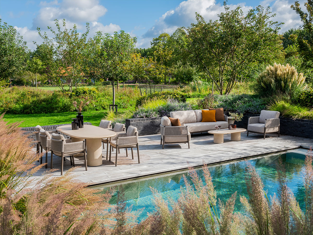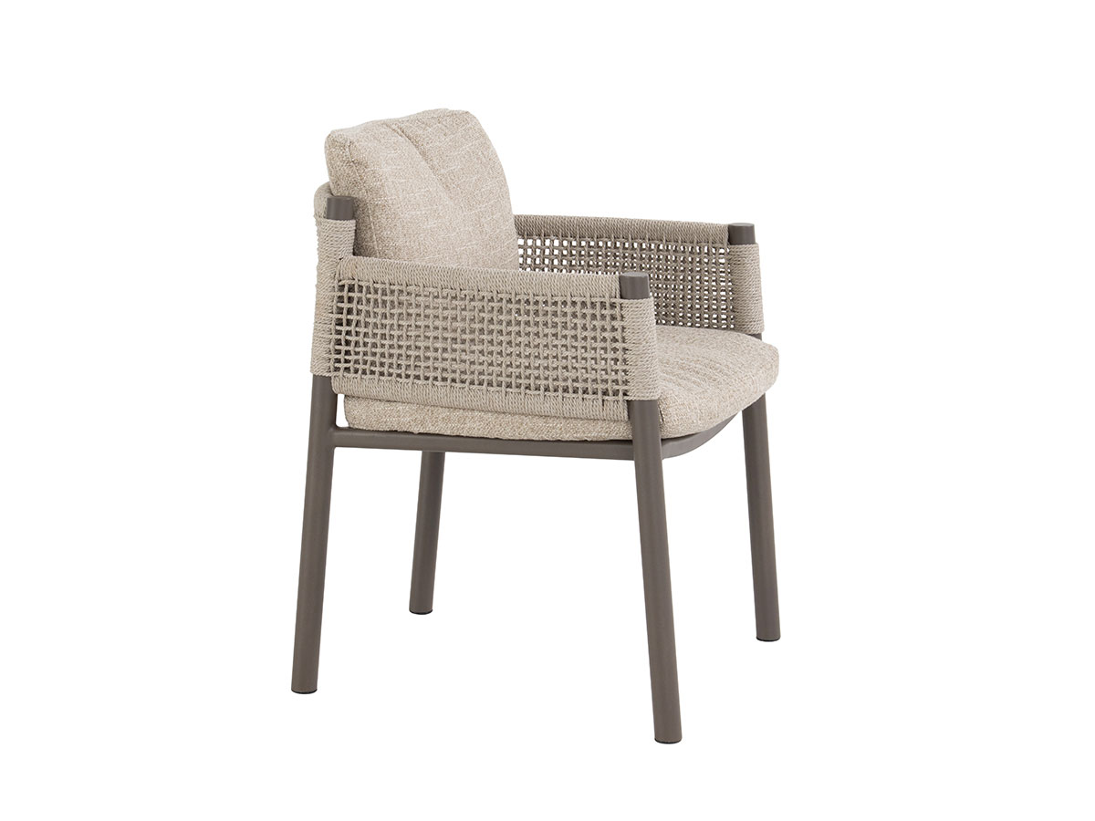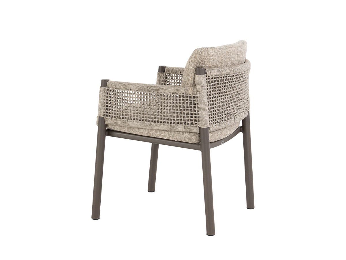 Das markante Merkmal des Savanne Dining Sessels ist sein vertikal gespanntes Rope. Diese feinen Linien verleihen dem Stuhl eine rhythmische, fast schwerelose Optik, die hervorragend mit modernen Gartentischen harmoniert. Der Rahmen aus hochwertigem, pulverbeschichtetem Edelstahl sorgt für die nötige Stabilität, während die zwei passgenauen Kissen dafür sorgen, dass auch das längste Dinner zum komfortablen Erlebnis wird.