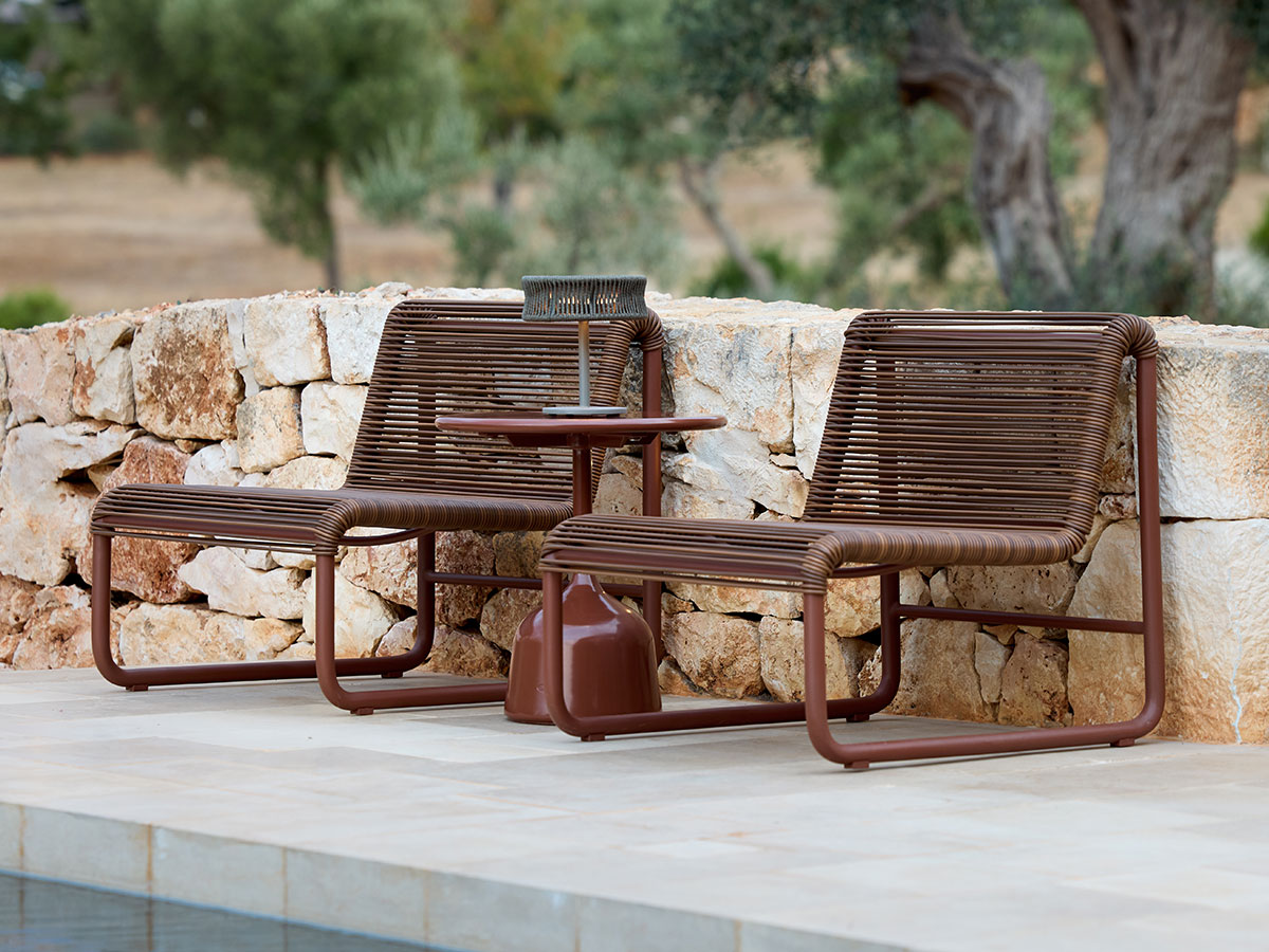 Konzipiert für den Einsatz im Outdoor-Bereich und ebenso stimmig in Innenräumen. Für die Pflege empfiehlt sich eine schonende Reinigung passend zu Geflecht und Rahmen.