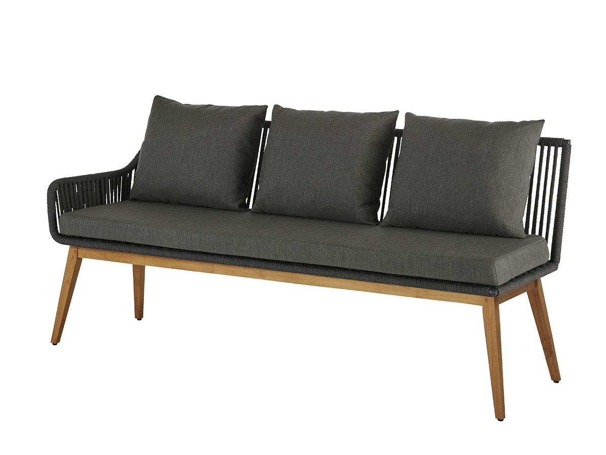 Dining Bank / Lounge mit einem Teak-Untergestell, kombiniert mit einem 14 mm breitem Ropeband in Dunkelgrau im Rückenteil. Incl. drei Sitz- und zwei Rückenkissen mit wasserabweisendem Olefin Stoff von Sunproof.