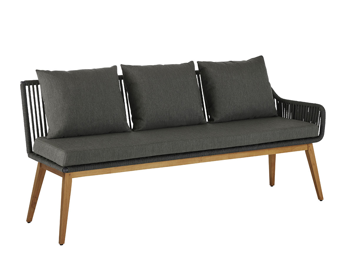 Dining Bank / Lounge mit einem Teak-Untergestell, kombiniert mit einem 14 mm breitem Ropeband in Dunkelgrau im Rückenteil. Incl. drei Sitz- und zwei Rückenkissen mit wasserabweisendem Olefin Stoff von Sunproof.