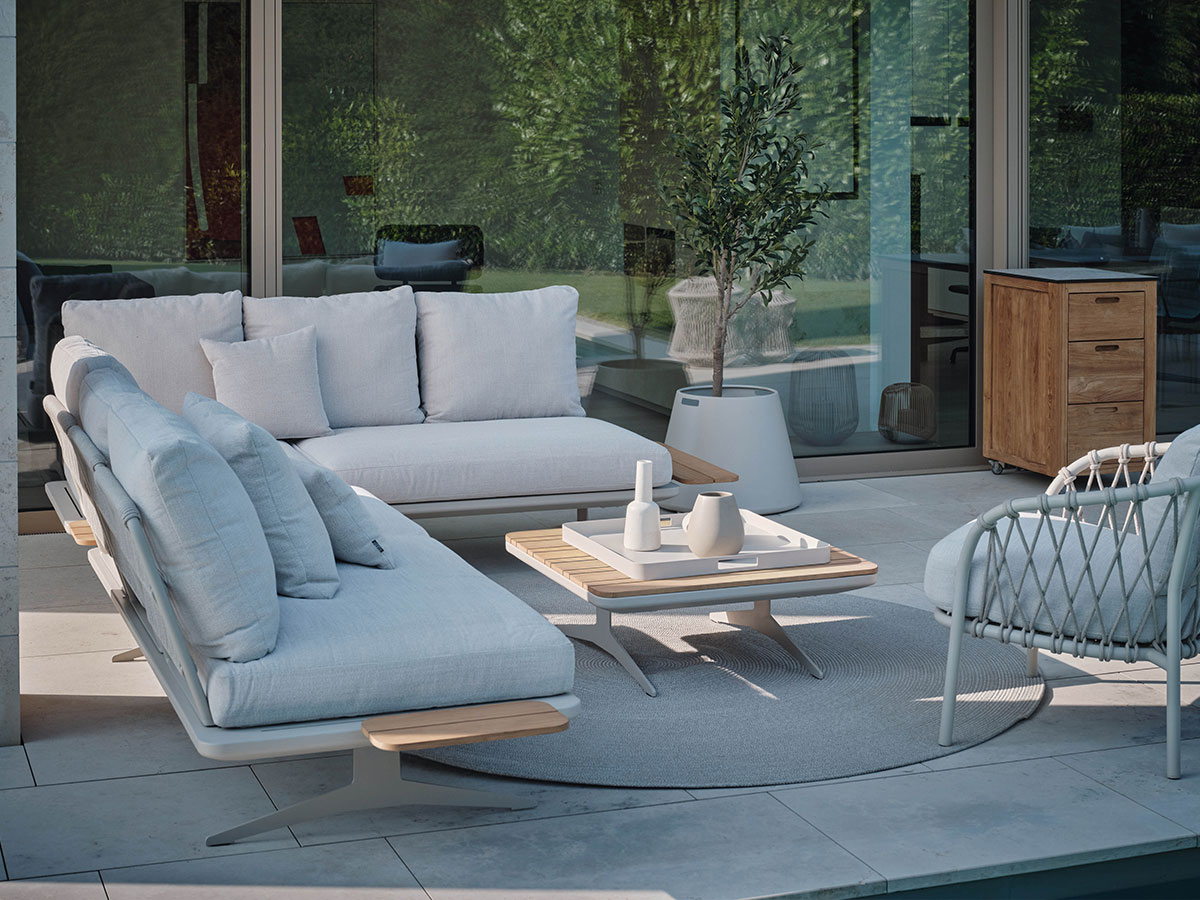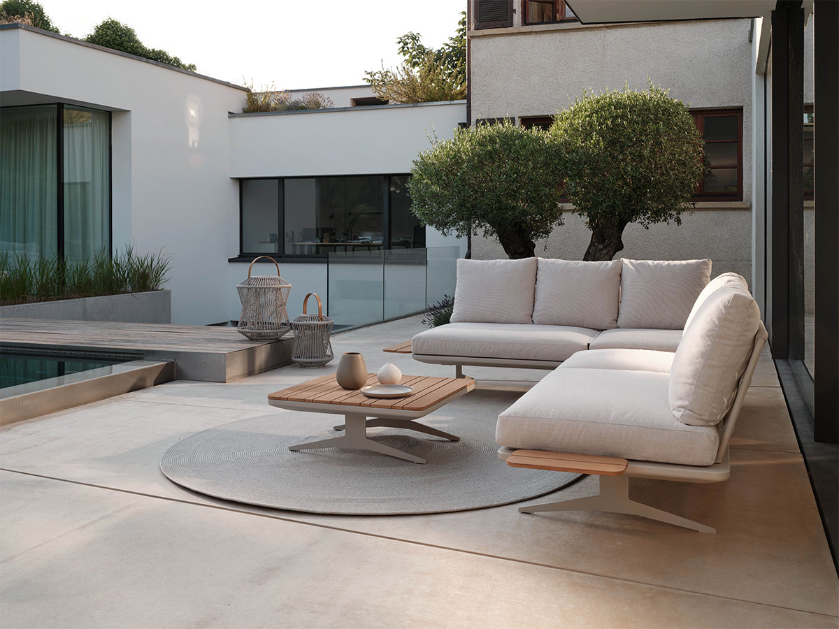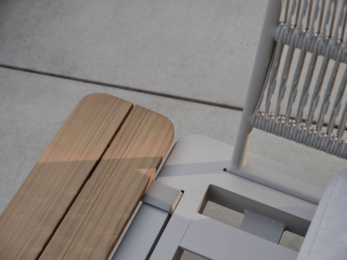 - Tischplatte: FSC®-zertifiziertes Teakholz. Es ist extrem wetterbeständig und robust. Der warme Holzton lockert die kühle Optik des greige-Rahmens stilvoll auf.