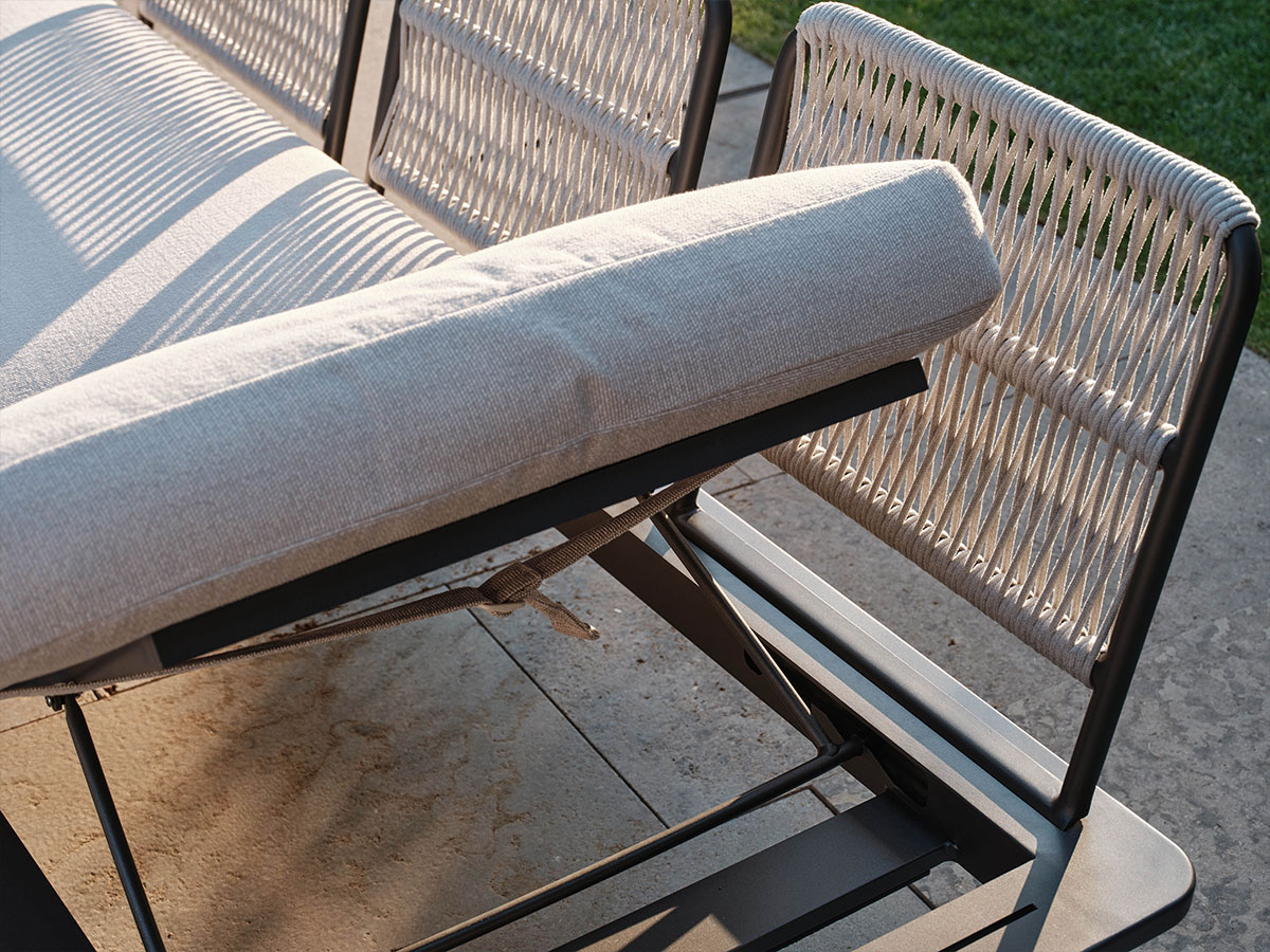 - Rückenlehnen: Die Bespannung aus Polypropylen-Kordel (Farbe Stone) ist reißfest, wasserabweisend und trocknet schnell.