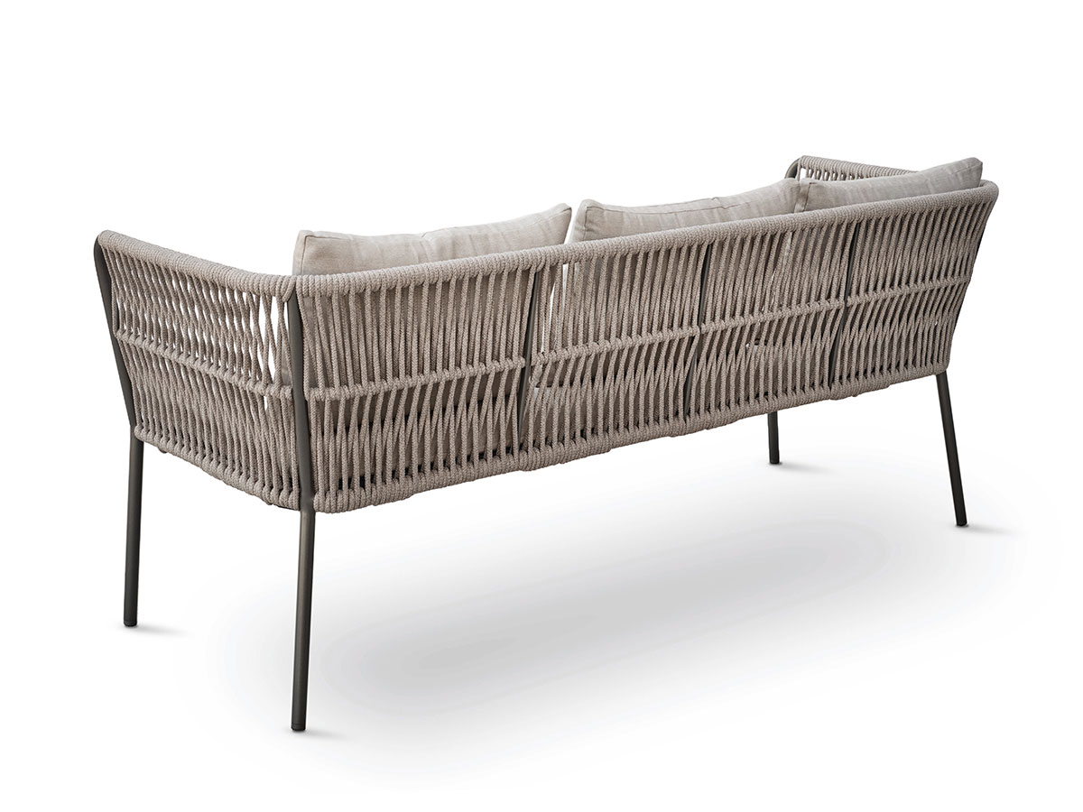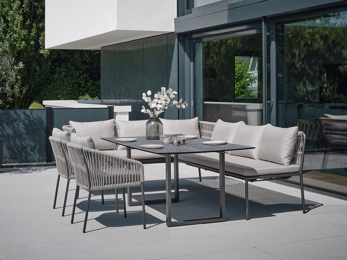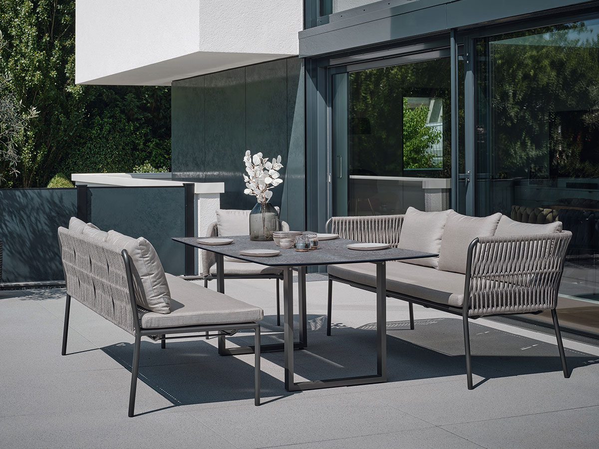 Die STERN Dining Bank MARLA mit Armlehnen verbindet die Gemütlichkeit eines Sofas mit der Funktionalität einer Esszimmerbank. Mit einer Gesamtbreite von 198 cm und hohen seitlichen Lehnen schafft sie einen geschützten, komfortablen Raum am Gartentisch. Das Design kombiniert ein modernes Aluminiumgestell in Anthrazit mit einer hellen Kordelflechtung (Farbe Salt) und unempfindlichen Polstern in Graubraun – ideal für lange, entspannte Dinner im Freien.