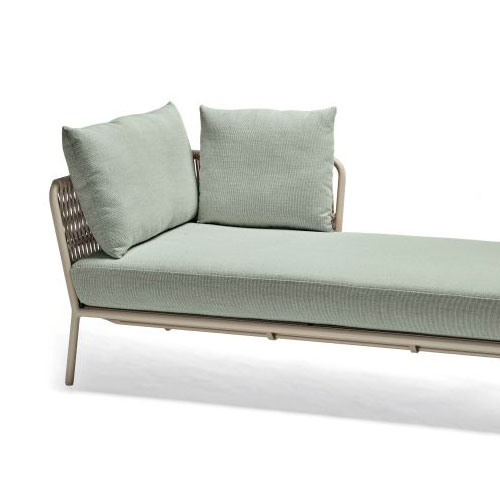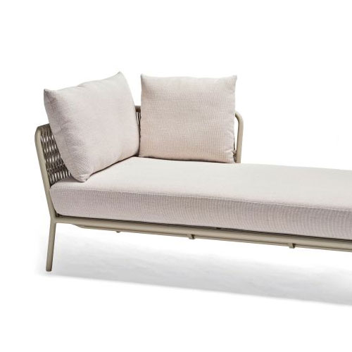 Die STERN Lounge Recamiere ROMY ist ein großzügiges Outdoor-Daybed, das modernes Design mit technischer Raffinesse verbindet. Mit einer Länge von 166 cm und einer Sitztiefe von 80 cm bietet sie besonders viel Platz zum Entspannen. Die Kombination aus einem pulverbeschichteten Aluminiumgestell in Greige, einer luftigen Kordelflechtung und der komfortablen Polsterung in Vanilla macht sie zum stilvollen Mittelpunkt auf der Terrasse – ob als Solitär oder als Abschluss einer Wohnlandschaft.