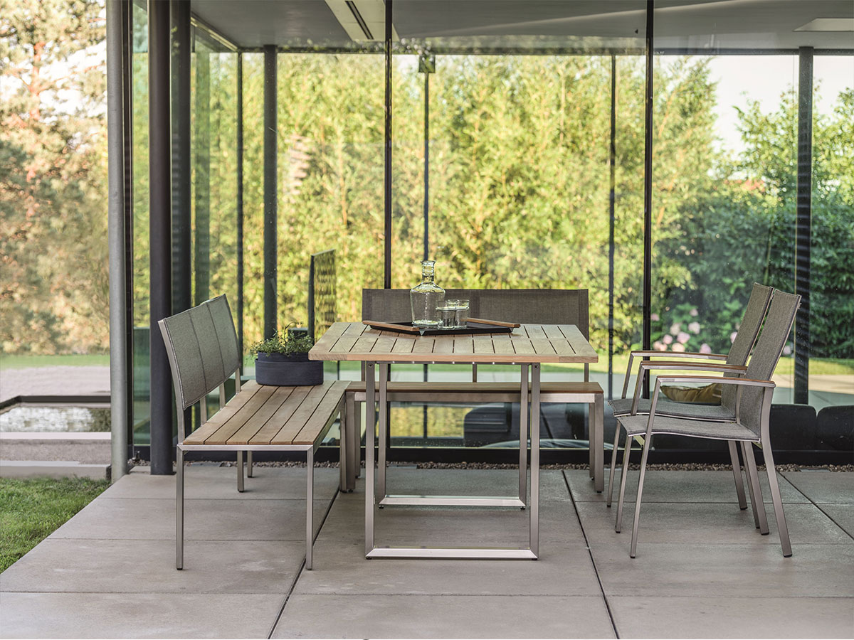 Stern Stapelsessel Mika Edelstahl/Bezug Textilen Leinen grau/Teakarmlehnen