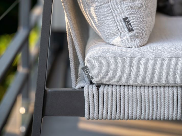 Die Tammo Bank setzt auf Langlebigkeit und Ästhetik. Das Gestell aus pulverbeschichtetem Aluminium in Anthrazit ist absolut rostfrei und witterungsbeständig. Ein besonderes technisches Detail ist die Unterbespannung aus silbernem Textilen, die unter der Kordelflechtung liegt. Dies sorgt nicht nur für eine optische Tiefe, sondern garantiert auch eine dauerhafte Formstabilität der Sitzfläche. Die markante 10 mm Kordel in Stone rundet das moderne Erscheinungsbild ab.