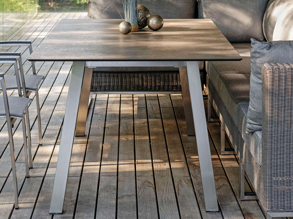 Das Tischsystem INTERNO zeichnet sich durch seine nach innen versetzten schräg gestellten Tischbeine aus. Das verleiht der ganzen Sitzgruppe einen attraktiven und spannenden Look.