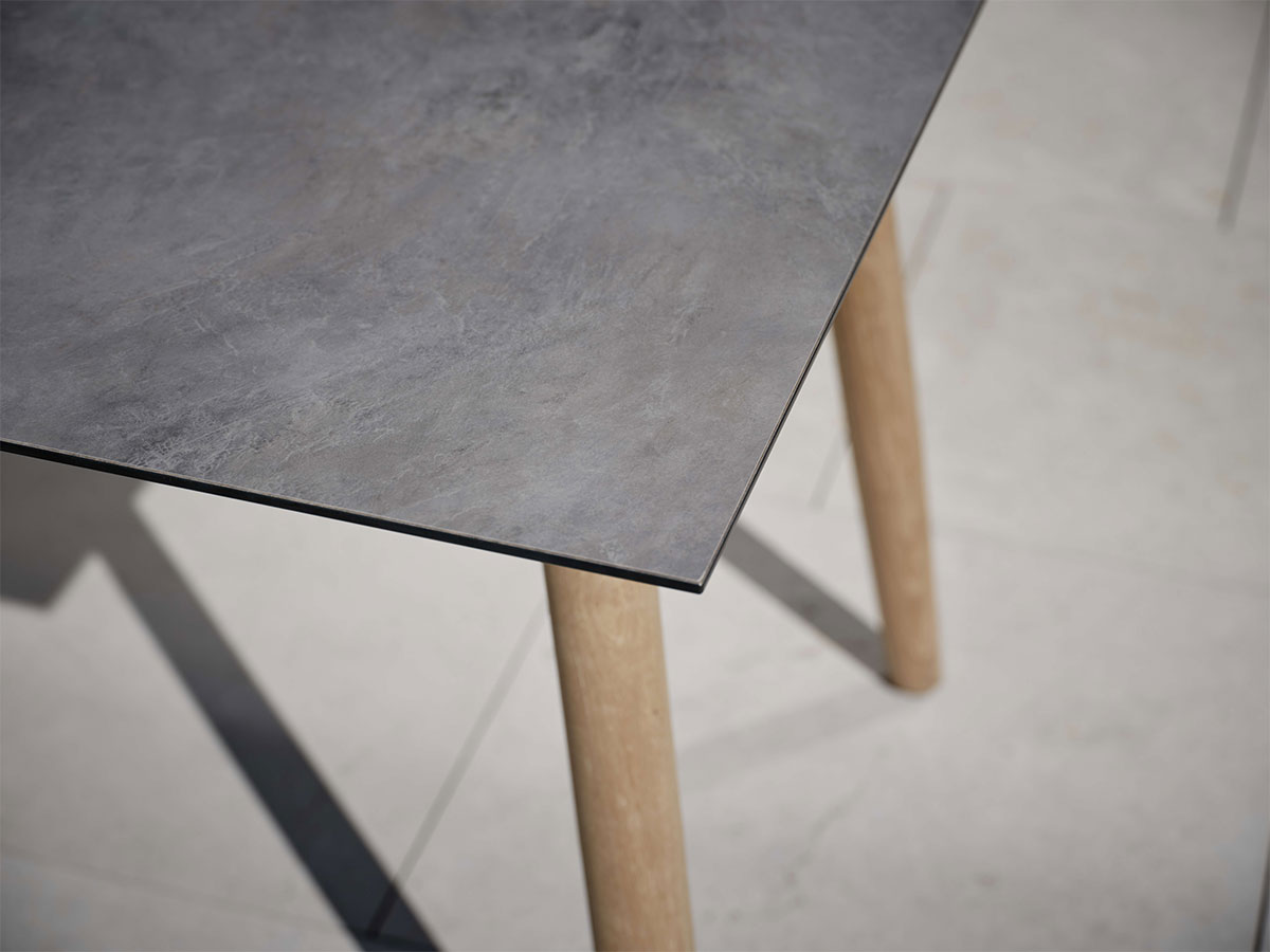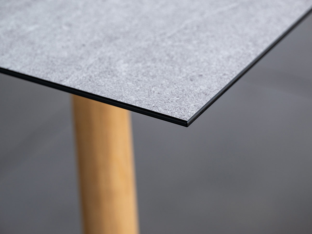 Stern Tischsystem mit Teak Beine rund konisch, Tischunterkante 68,5 cm. Großer Auswahl an Tischplatten, Teakholz und Silverstar 2.0.