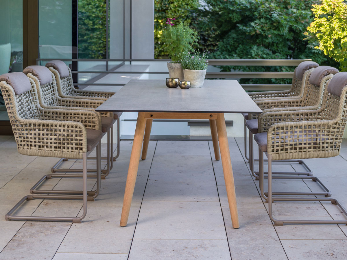 Das Tischsystem INTERNO zeichnet sich durch seine nach innen versetzten schräg gestellten Tischbeine aus. Das verleiht der ganzen Sitzgruppe einen attraktiven und spannenden Look.